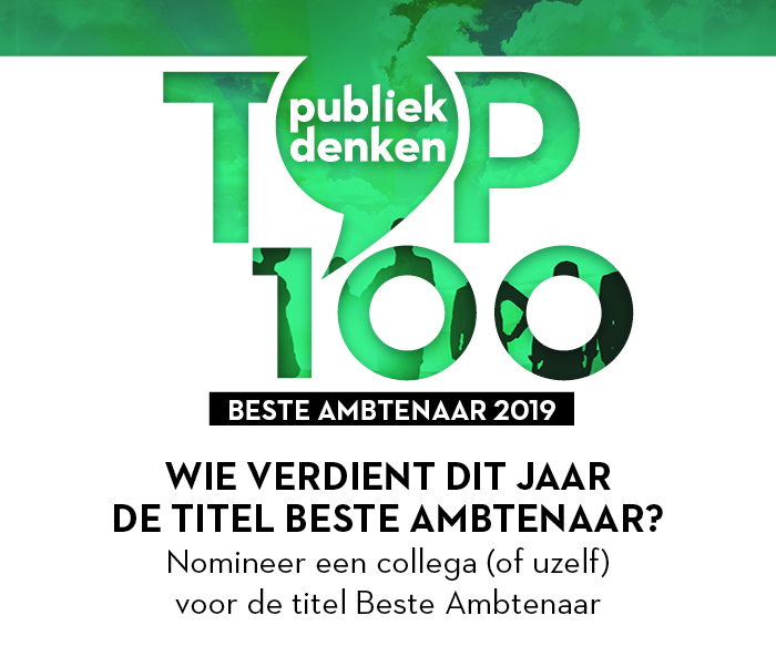 Met de Publiek Denken Top 100 richten we de schijnwerper op succesvolle sleutelfiguren bij de overheid, die vaak achter de schermen opereren. Wat maakt hen tot een voorbeeld voor anderen? Nomineren is mogelijk in zes categorieën: 1) rijksoverheid management, 2) rijksoverheid beleid en 3) rijksoverheid uitvoerend/ondersteunend en 4) decentrale overheden management, 5) decentrale overheden beleid en 6) decentrale overheden uitvoerend/ondersteunend. Wil jij je collega nomineren, dat kan tot 14 oktober op https://publiekdenken.nl